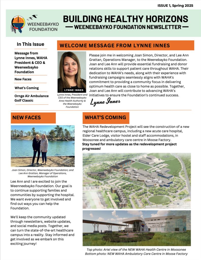 The Weeneebayko Foundation is committed to keeping you informed through clear and meaningful updates. Our newsletters and media releases share how your support is helping improve care at the Weeneebayko Area Health Authority (WAHA).